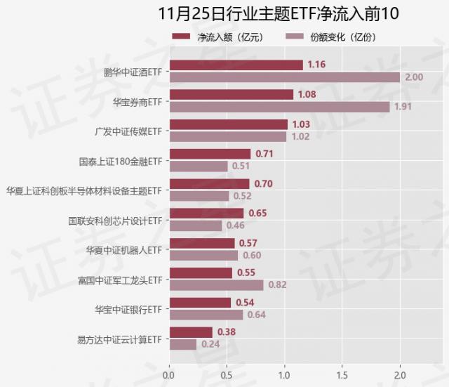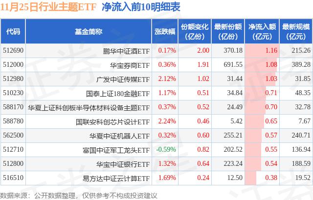 具体到当日的资金流动情况,有55只行业主题ETF基金获得资金净流入,其中鹏华中证酒ETF(512690)表现突出,成为资金流入最多的产品,其份额增加了2.0亿份,对应的净流入额为1.16亿元。
