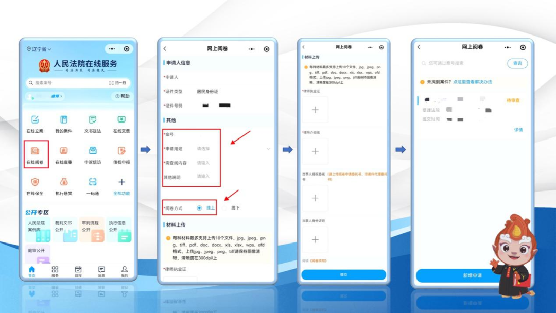 若选择“人民法院在线服务全国版”微信小程序,注册登录后,在首页点击“在线阅卷”功能,或在“我的案件”空间里选择“在线阅卷”提交申请。提交时需填写“申请用途”“需查阅内容”等信息,选择“线上”阅卷方式,并上传身份证明、委托代理手续等材料,提交后等待审核即可。