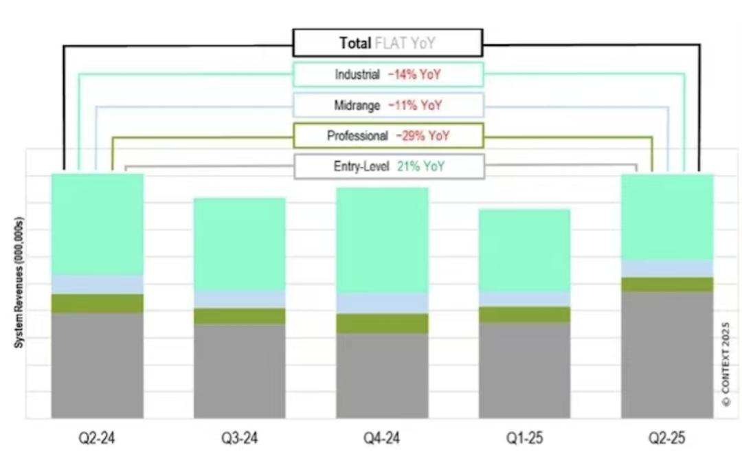 当前消费级3D打印市场仍处早期,格局未定型。CONTEXT报告显示,2025年第二季度仅入门级市场同比增长21%,其余品类均负增长,成为全球3D打印市场“全村的希望”。不少人将其与早年扫地机器人市场类比,期待爆发式增长。