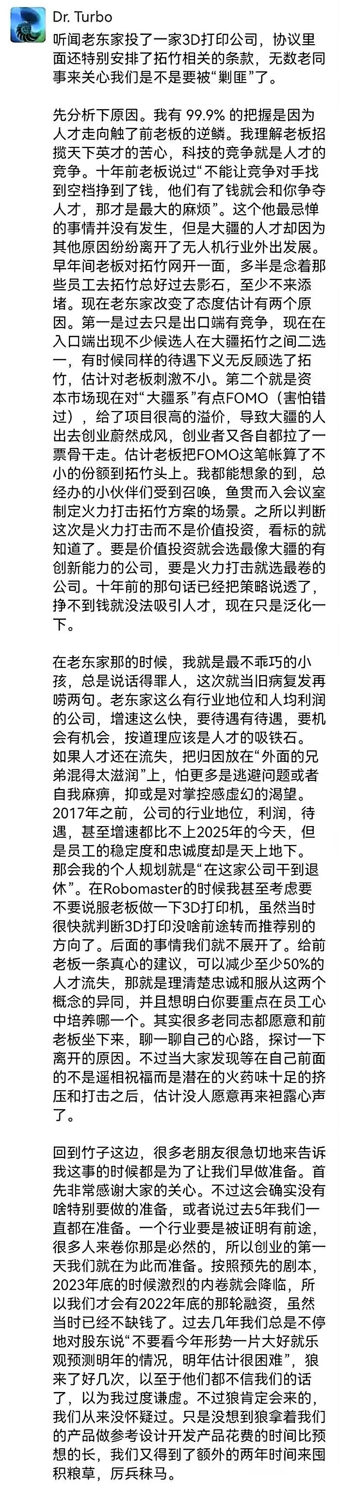 陶冶在朋友圈发文称,老东家大疆投资的智能派协议中含针对拓竹的条款,他认为99.9%是因人才流动触了前老板逆鳞,还直言大疆投资并非“价值投资”,而是借智能派对竞争对手“火力打击”,选的是“最卷的公司”。
