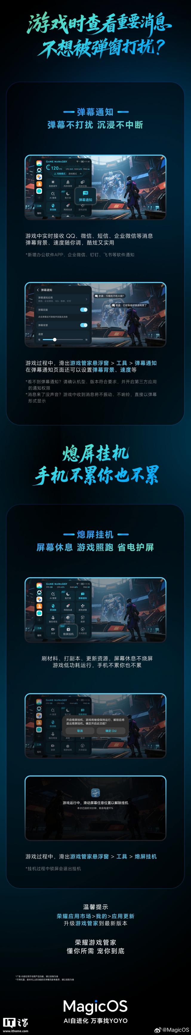 目前荣耀手机正持续完善游戏辅助功能体系。据 IT 之家此前报道,本月初荣耀 MagicOS 官方微博曾宣布游戏管家工具新增弹幕通知与熄屏挂机两项功能。此外,《王者荣耀》144Hz 模式已进入申请流程,@荣耀冯同学 表示该功能很快将推送至用户设备。