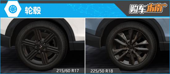 轮毂提供两种黑色涂装选择:17英寸六辐式轮毂匹配215/60 R17轮胎;18英寸双五辐式轮毂匹配225/50 R18轮胎。