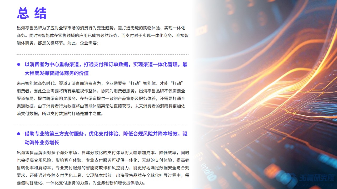 生成式AI的快速发展正在推动“智能体商务”的广泛应用。这一新兴模式借助AI智能体重构消费流程、拓展销售场景,并大幅提升运营效率。需要强调的是,智能体商务并非独立存在,而是与一体化商务深度融合:AI赋能让品牌能够实现超高效、高个性化的无缝体验,形成“一体化×智能化”的叠加效应,打开全新增长空间。目前出海企业对AI智能体的应用仍处于探索阶段,其在营销推荐、供应链优化、支付风控等环节的潜力尚未充分挖掘,未来增长潜力巨大。