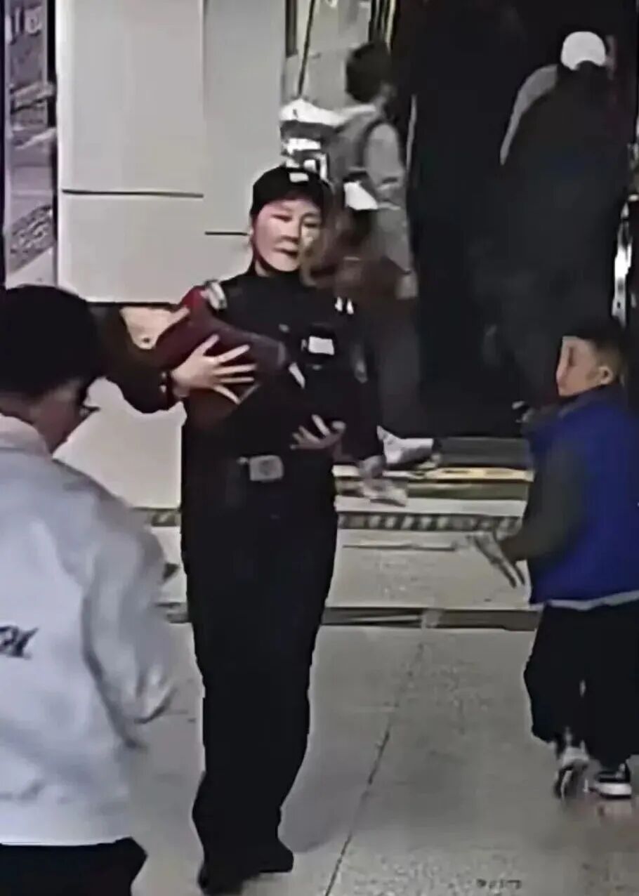 她微微弓着背,让孩子的小脑袋稳稳靠在肩头,右手始终护着孩子的后背