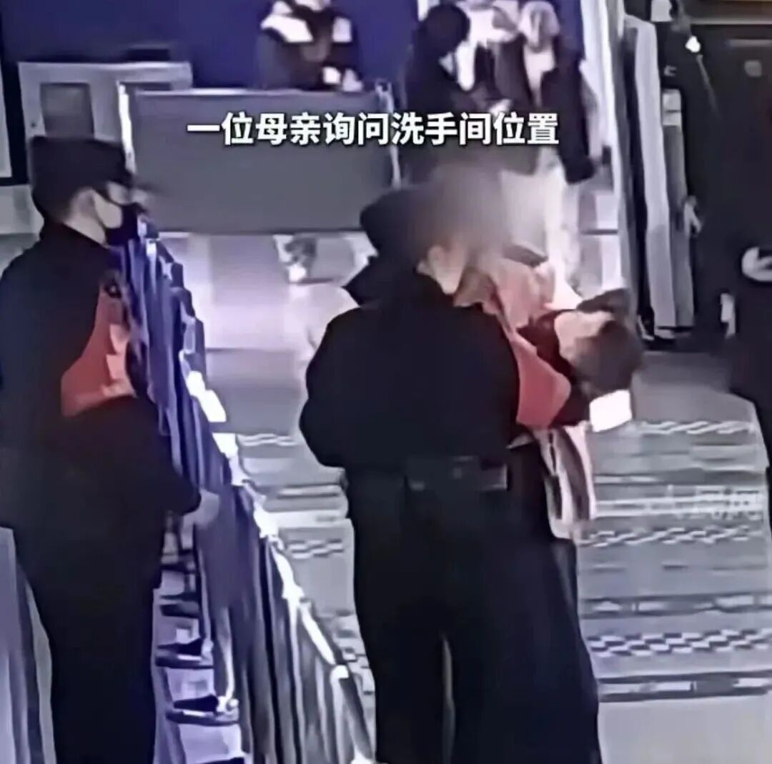 一位年轻母亲抱着熟睡的孩子,在人群中焦急地穿梭