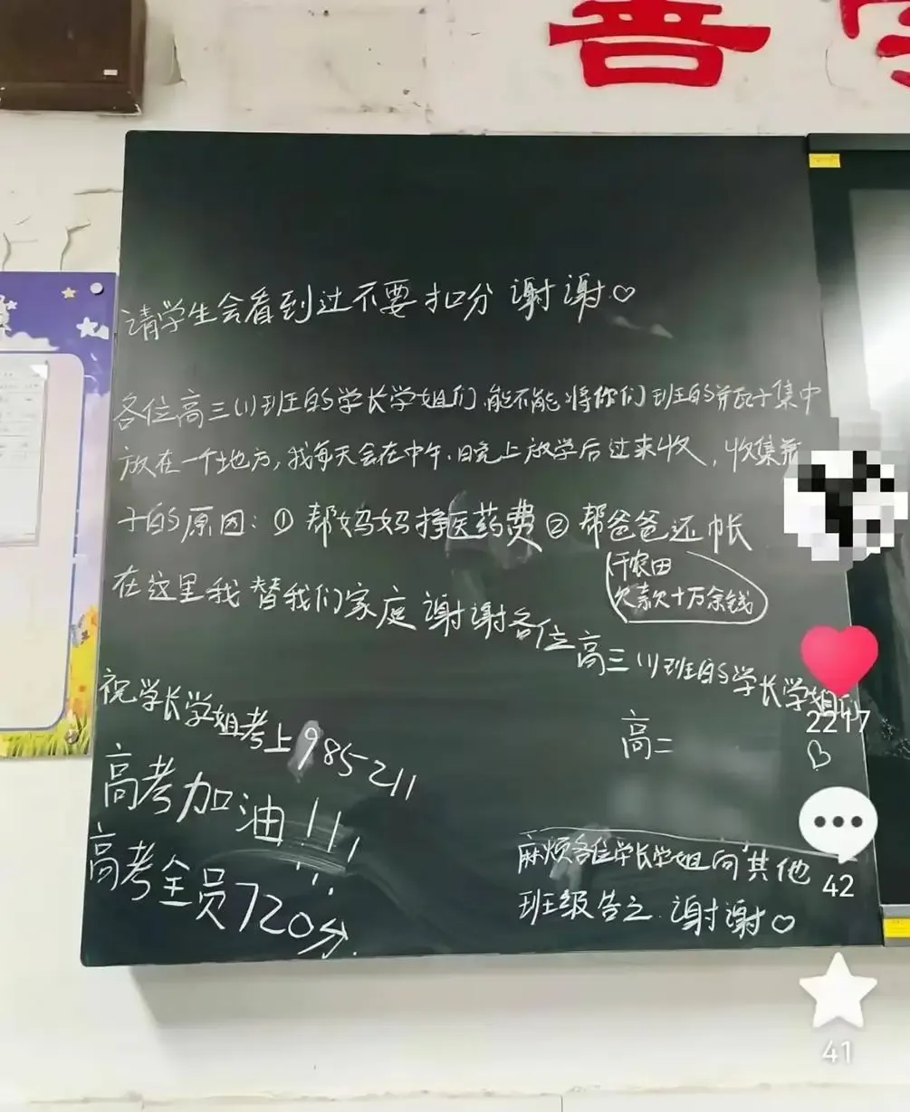 近日,安徽淮南第五中学一名高二学生在黑板上的留言引发网络关注。他写道:“各位高三(1)班的学长学姐们,能不能将你们班的瓶子集中放在一个地方,我会来收。”这行简单的文字背后,藏着少年为母亲挣医药费、帮父亲还债的生活重担,同时他还不忘祝福学长学姐高考顺利,并请求学生会不要因此扣分。