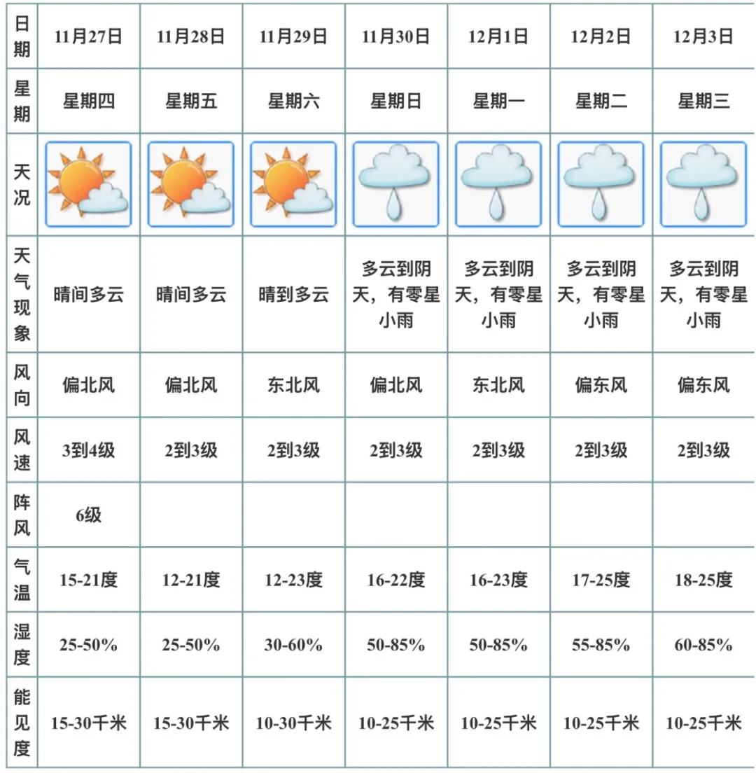 据预测,11月27日至29日期间天气晴朗干燥,早晚时段气温较低;海上风力偏大,从事航运相关活动的人员请务必注意安全。11月30日到12月3日,天气将转为多云到阴天,可能会出现零星小雨。