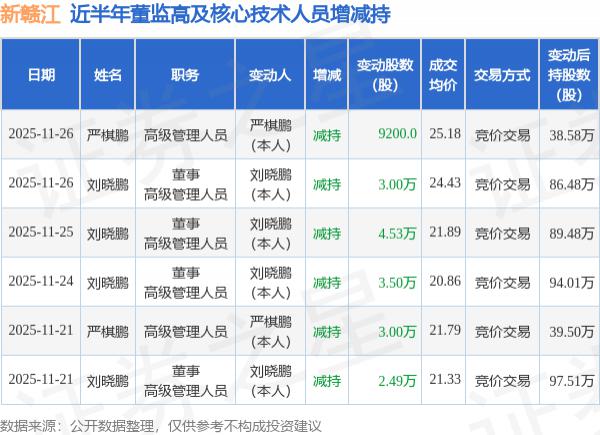 新赣江高管减持动态:11月26日刘晓鹏、严棋鹏合计减持3.92万股