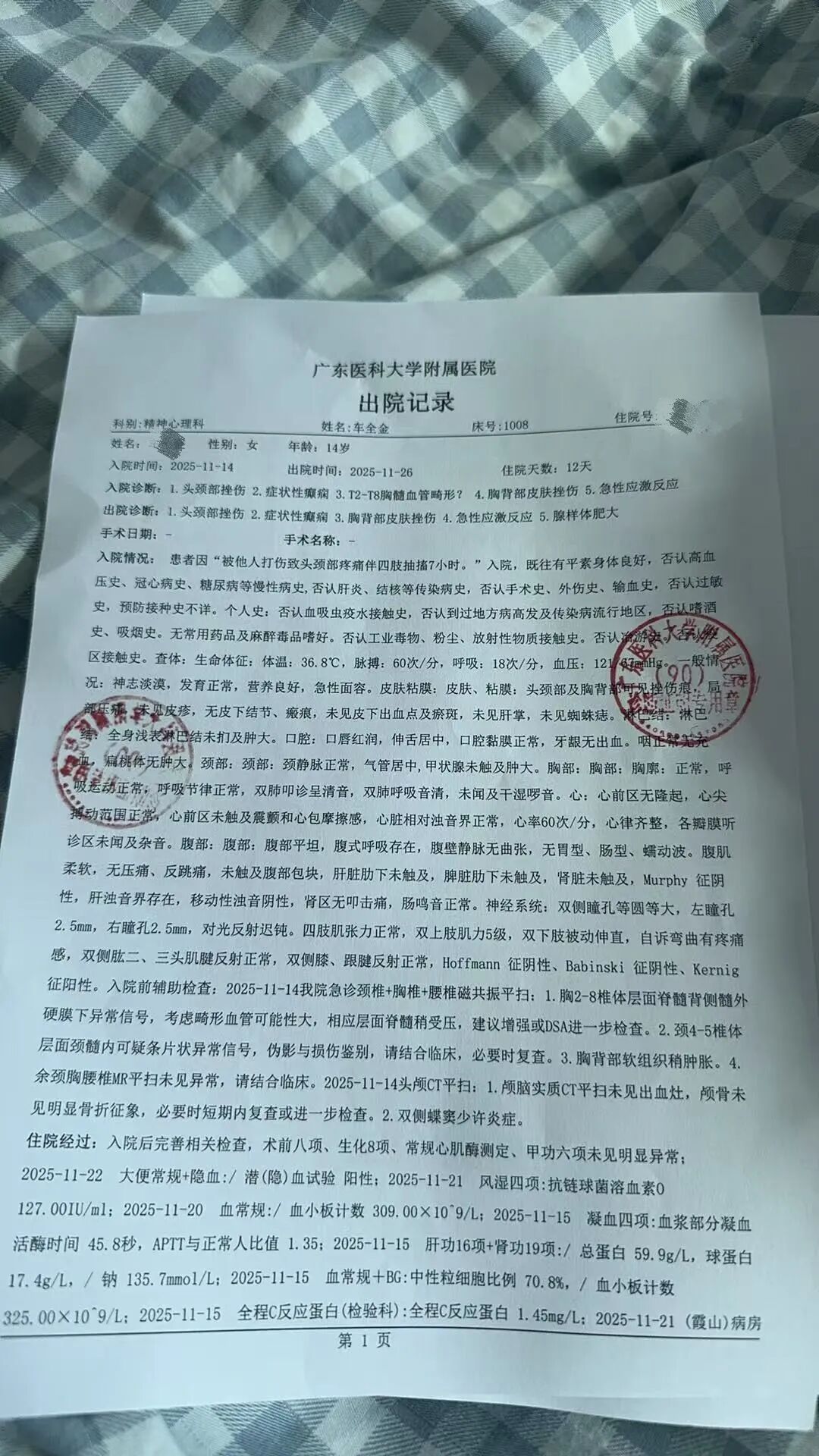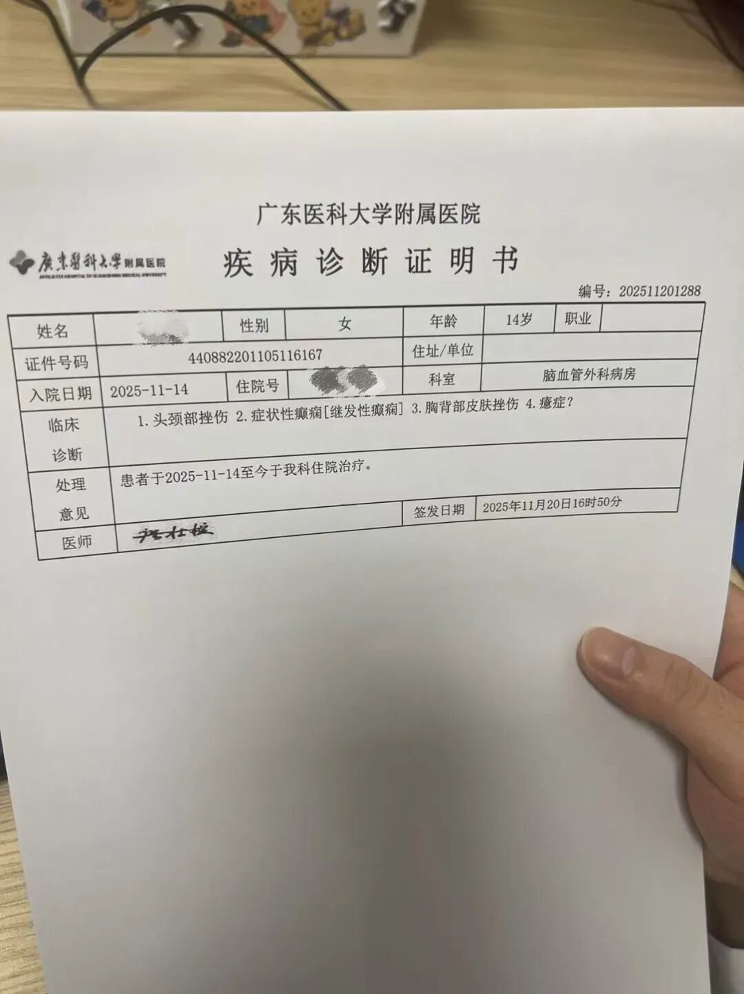 朽女士表示,送医途中,车某先后被英利中心卫生院、雷州市仁康医院拒收,最后被广东医科大学附属医院收治,截至11月25日已住院14天。医院的疾病诊断证明书显示,车某被确诊为头颈部挫伤、症状性癫痫(继发性癫痫)、胸背部皮肤挫伤,同时标注癔症待查。朽女士说,孩子事发前很少生病,现在癫痫发作没有规律,病情一直没好转,家人非常担心。