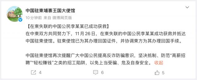11月26日晚间,中国驻柬埔寨大使馆发布消息,经过中柬双方的共同努力,11月26日,在柬埔寨失联的中国公民李某某成功获救并抵达中国驻柬使馆。目前,驻柬使馆已为其办理回国证件,并协调柬方协助办理回国手续。