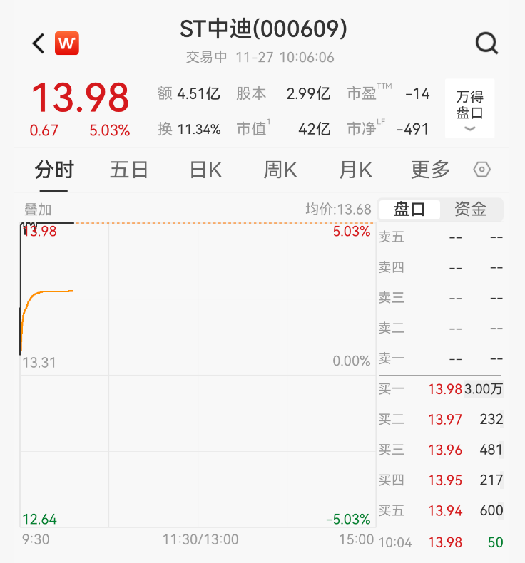 11月27日早盘,ST中迪开盘后迅速直线涨停,至此已录得8天4板的行情。