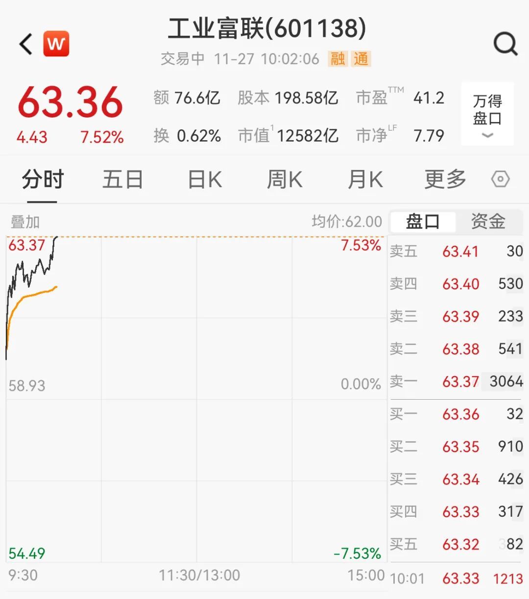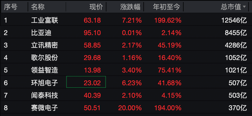 当日上午,消费电子代工指数大涨5%,板块内工业富联涨超7%,报63.36元/股,最新市值达12582亿元;立讯精密涨超2%,歌尔股份、领益智造、环旭电子等个股亦纷纷上扬。