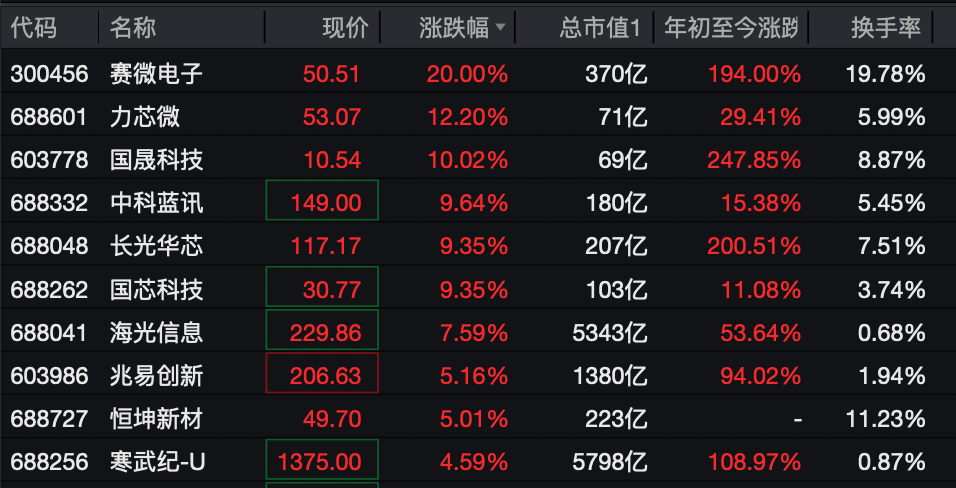 11月27日早盘,半导体板块延续近期强势表现。个股中,赛微电子大涨20%,报50.51元/股,股价再创历史新高;国晟科技强势涨停,力芯微涨幅超12%。