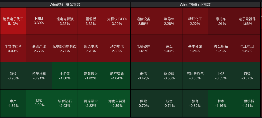 板块方面,通信设备与半导体板块成为当日领涨主力,消费电子代工、锂电电解液、光模块CPO、覆铜板等相关概念股亦表现活跃;而海南自贸港、两岸融合、培育钻石、水产、航空运输等板块则出现不同程度的回调。