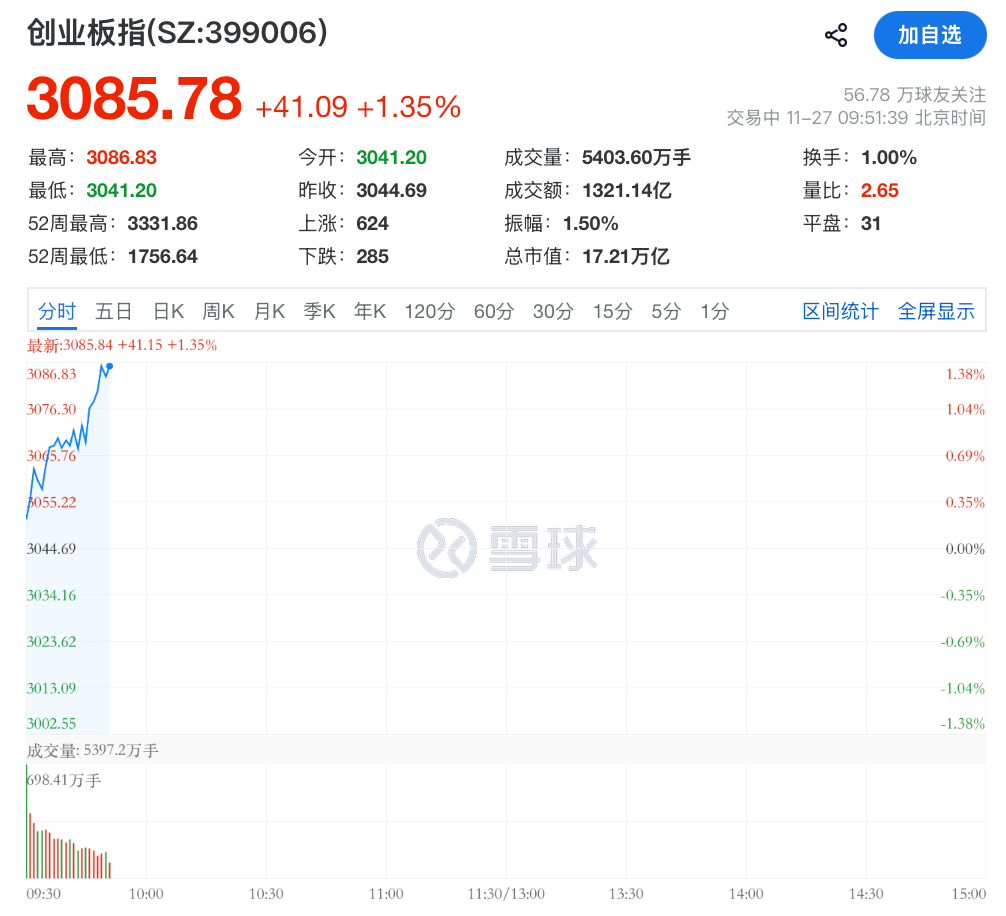 11月27日,A股三大股指开盘呈现分化态势,沪指微幅高开0.08%,深成指与创业板指则分别低开0.03%和0.11%。