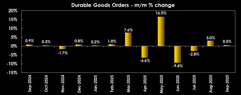 美股市场向来遵循涨多回调、跌多反弹的规律,背后无需复杂理由支撑。盘前公布的美国9月耐用品订单数据显示,其环比增长0.5%,超出市场预期的0.3%;其中剔除运输项目的核心耐用品订单环比增速达0.6%,不仅高于预期数值,还优于前值表现。这一数据表明企业资本开支仍在持续,对于判断美国经济能否实现软着陆具有关键意义。