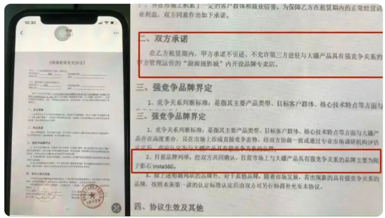 摄影城物业管理方与湖南知航无人机技术有限公司签署的《商铺租赁补充协议》显示,协议明确规定“不允许第三方进驻与大疆产品具有强竞争关系的品牌在湖南摄影城内开设品牌专卖店”,且“强竞争品牌界定”中直接注明“目前市场上与大疆产品具有强竞争关系的品牌主要限于影石Insta360”。