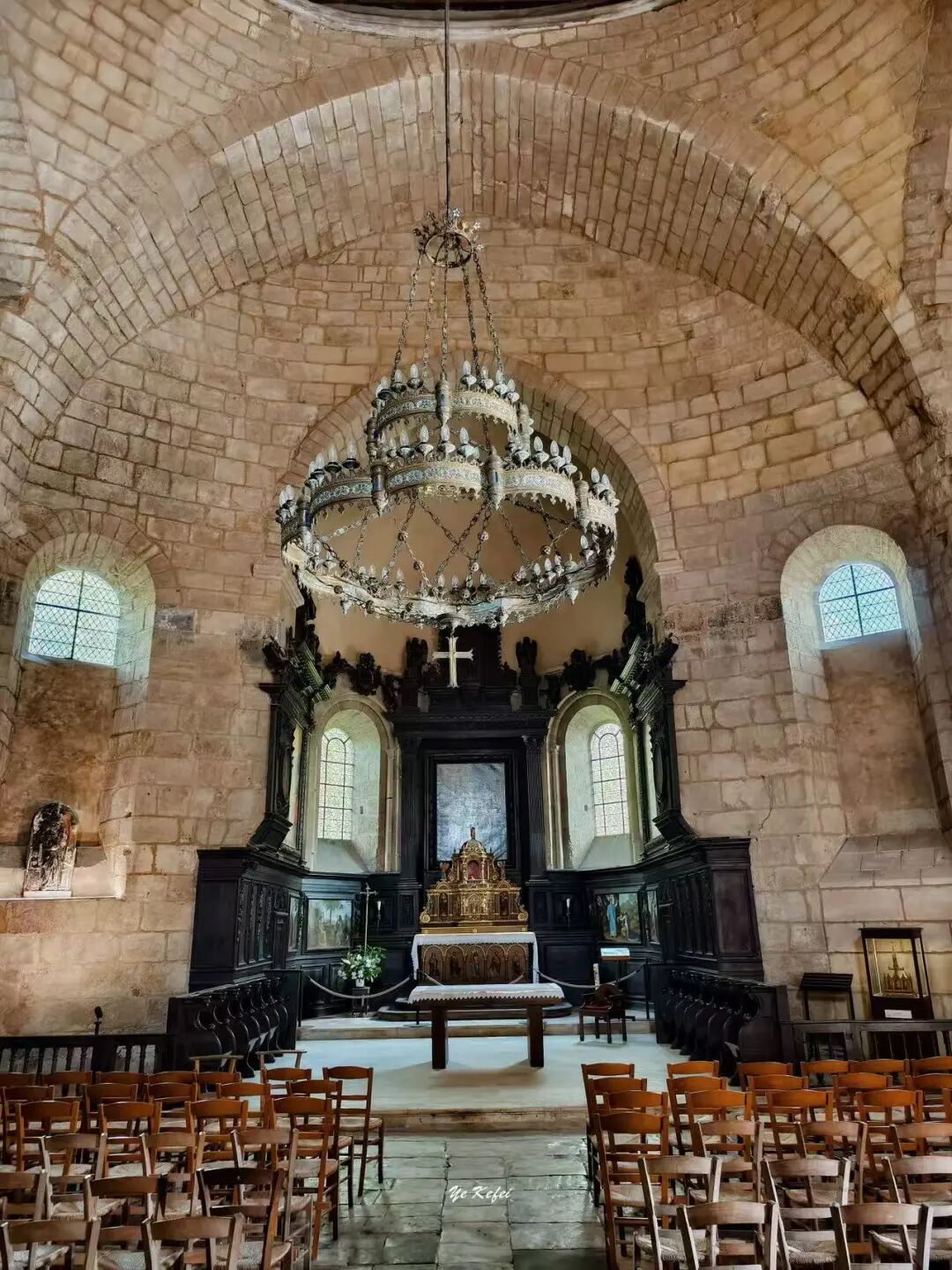 教堂外观古典,呈独特的拜占庭风格:矮胖椭圆形主体搭配方正罗马式钟楼,据说在法国独一无二。内部以石块砌成拱顶,木椅摆满大厅,黑色祭坛雕像精致。最初设计的12米直径圆拱顶,本可成为当时多尔多涅最大拱顶,却因超出建造能力未完工;18、19世纪屋顶两度崩塌,最终当地人以红棕色瓦片覆盖的木质屋顶替代。