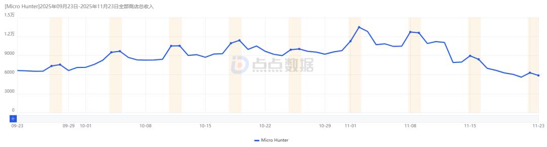 《Micro Hunter》更名以来,双端累计预估收入呈缓慢上升趋势。截至11月23日,累计收入约55万美元,单日峰值出现在11月2日,约1.3万美元。