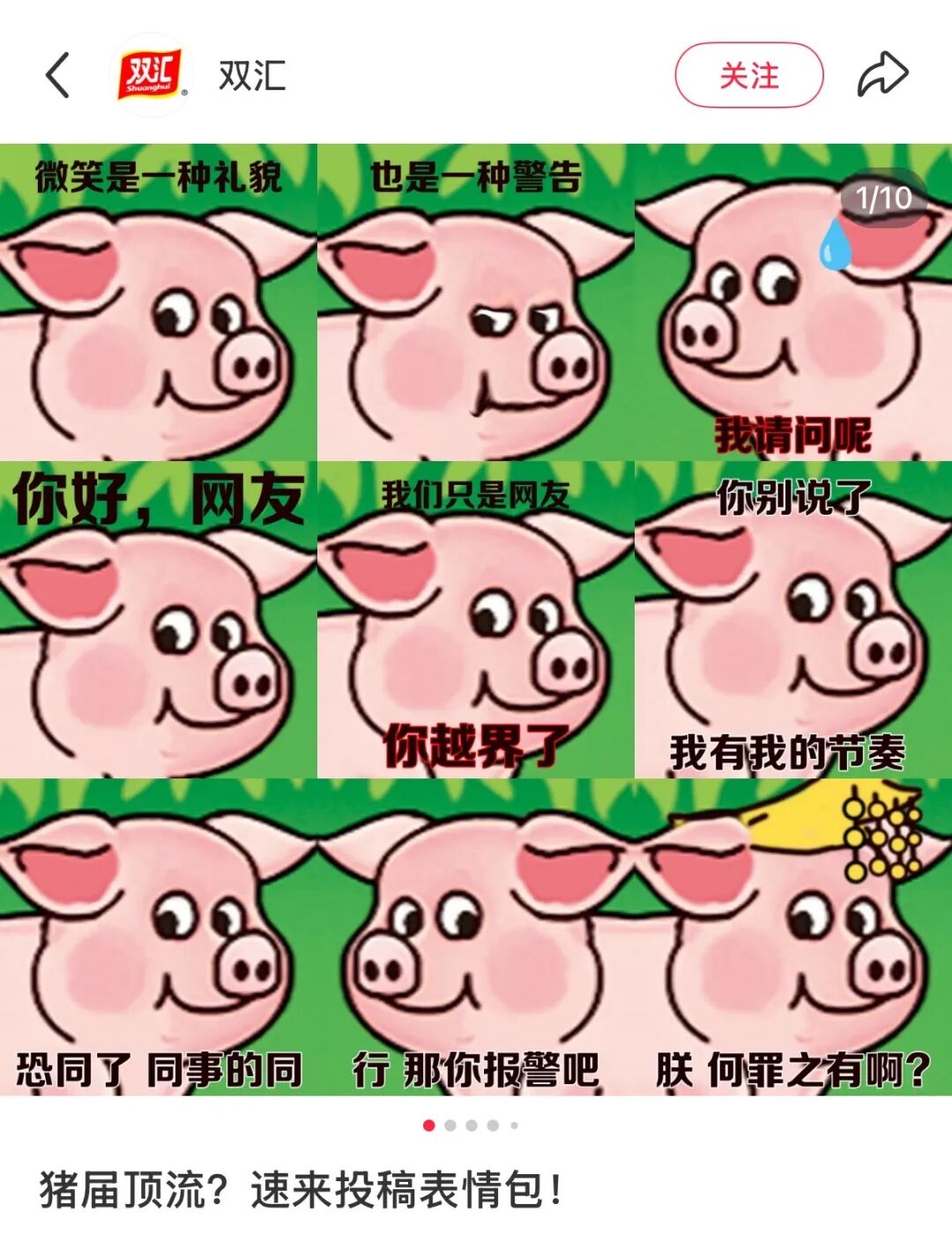 “玩梗”也能为品牌带来意外曝光。今年6月,一只表情独特的小粉猪意外走红,后被发现是双汇火腿肠海外版包装袋上的卡通形象,网友对其进行表情包二创,双汇官方迅速认领,制作一系列表情包邀请用户二创,小粉猪顺势晋升为双汇吉祥物和形象IP。