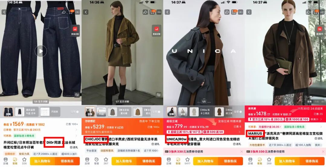在天猫旗舰店中,四个品牌均推出“奢牌同源高端面料”产品,社交媒体上也被称为“奢侈品平替”(高级基本款),定价多在百元至千元区间,部分单品达万元。