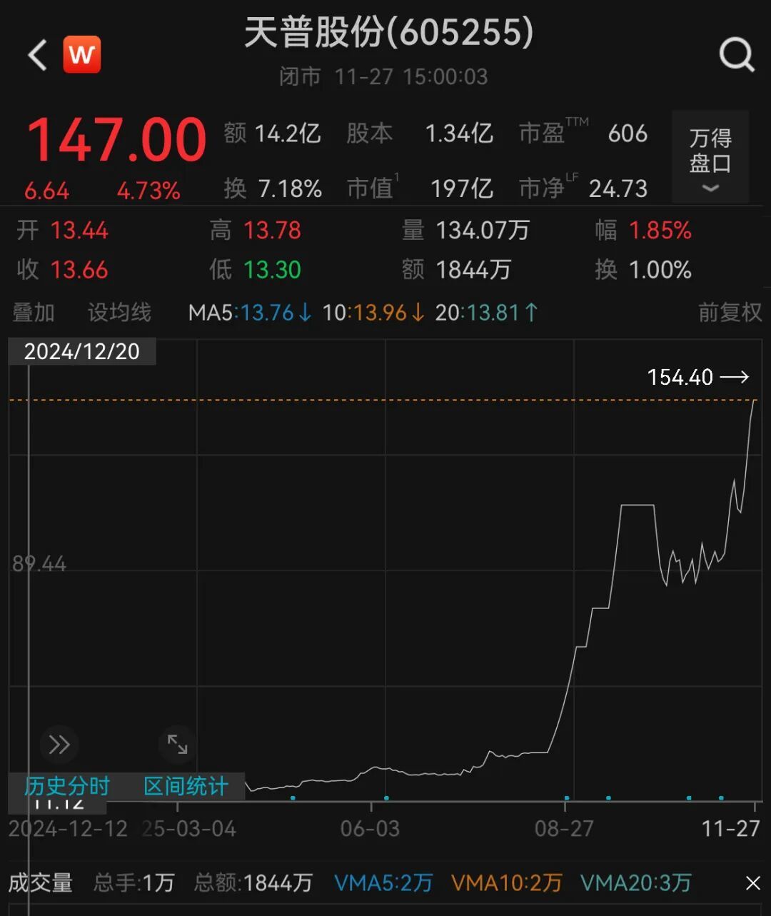 截至11月27日收盘,天普股份(605255.SH)今年以来的累计涨幅已突破1000%,成为市场瞩目的“十倍牛股”。