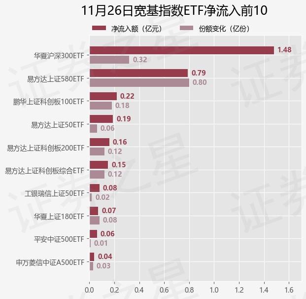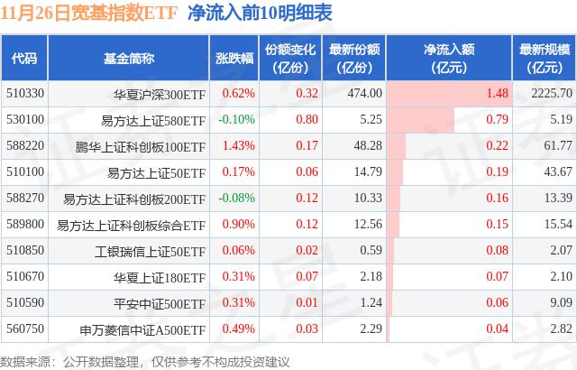 当日,在宽基指数ETF基金中,有17只实现了资金净流入。其中,华夏沪深300ETF(510330)的净流入规模居首,其份额增加了3150.0万份,对应的净流入额为1.48亿元。