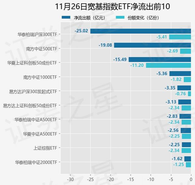 与此同时,当日有88只宽基指数ETF基金出现资金净流出。华泰柏瑞沪深300ETF(510300)的净流出情况最为突出,其份额减少了5.41亿份,净流出额高达25.02亿元。