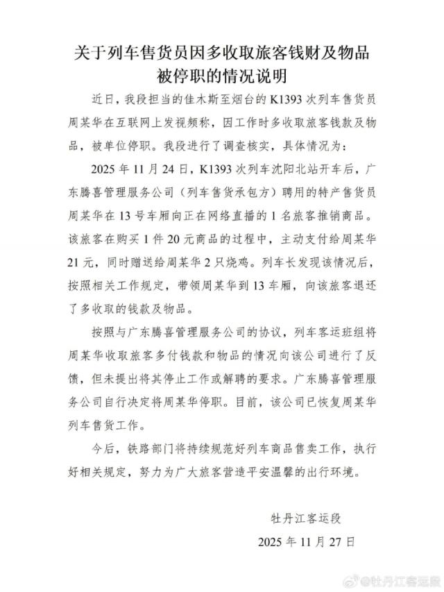当日,牡丹江客运段发布情况说明:2025年11月24日,K1393次列车沈阳北站发车后,广东腾喜管理服务公司聘用的售货员周某华在13号车厢向直播旅客推销商品。旅客购买20元商品时主动支付21元并赠送2只烧鸡,列车长发现后带周某华退还钱款物品。