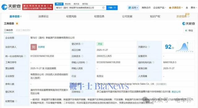 天眼查App信息显示,11月27日,智马行(温州)新能源汽车销售有限责任公司正式成立,该公司法定代表人为刘彦明,注册资本达2亿元人民币,业务范围涵盖新能源汽车整车销售、新能源汽车电附件销售、新能源汽车换电设施销售以及汽车销售等多个领域。
