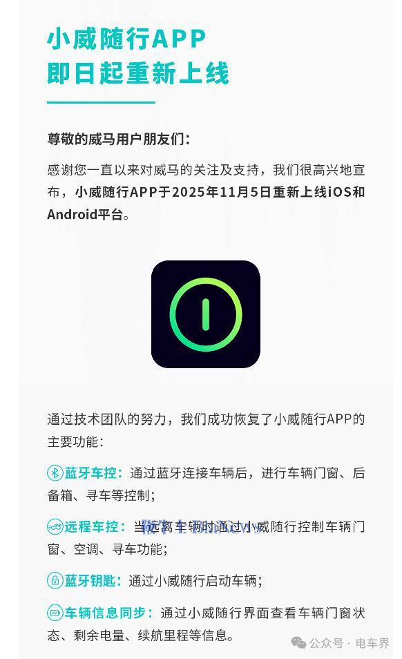 11月5日,威马汽车宣布“小威随行APP”重新启动,在iOS和Android平台同步上线,恢复了蓝牙车控、远程车控、蓝牙钥匙等核心功能,用户过往的账号及车辆信息也都得以保留。