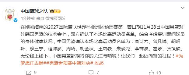 中国男篮此次世预赛首战的12人名单具体为:高诗岩、曾凡博、胡明轩、廖三宁、程帅澎、周琦、胡金秋、王岚嵚、朱俊龙、李祥波、雷蒙、张镇麟。