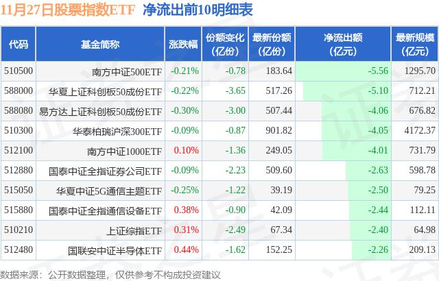 当日有223只股票指数ETF基金出现资金净流出,南方中证500ETF(510500)的净流出额居首,份额减少了7840.0万份,净流出资金为5.56亿元。
