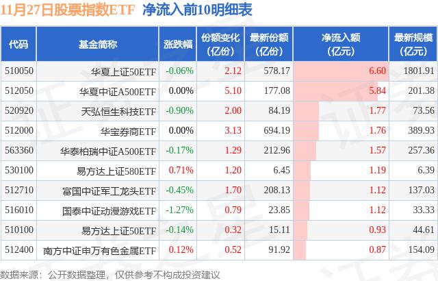 当日共有147只股票指数ETF基金实现资金净流入,其中华夏上证50ETF(510050)的净流入额最高,份额增加了2.12亿份,净流入资金达6.6亿元。