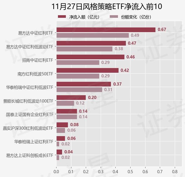 据证券之星消息,11月27日,风格策略类ETF基金整体呈现资金流入态势,合计净流入金额为2.73亿元。从近期表现来看,近5个交易日该类ETF累计净流入资金达24.49亿元,且在这5个交易日里,有4天实现了日资金合计净流入(ETF资金流向的计算方式为:(当日ETF场内流通份额 - 前一交易日ETF场内流通份额)×当日ETF均价,该计算结果仅供参考)。