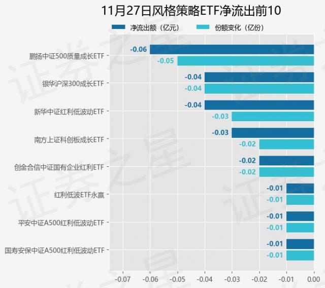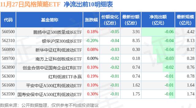 与此同时,当日有8只风格策略ETF基金出现资金净流出情况。鹏扬中证500质量成长ETF(560500)是净流出金额最高的产品,其份额减少了500.0万份,净流出额为565.58万元。