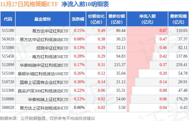 当日,在风格策略ETF基金中,共有12只产品获得资金净流入。其中,易方达中证红利ETF(515180)成为资金流入最多的产品,其份额增加了4900.0万份,对应的净流入金额为6743.51万元。