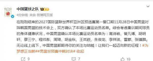 官方给出的说明是:“综合考虑集训期间球员的身体健康状况,中国男篮确认本场比赛运动员名单为:高诗岩、曾凡博、胡明轩、廖三宁、程帅澎、周琦、胡金秋、王岚嵚、朱俊龙、李祥波、雷蒙、张镇麟。”