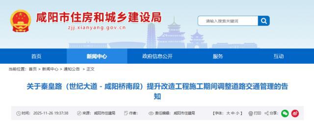 咸阳市住房和城乡建设局于11月26日发布通知,将秦皇路(世纪大道—咸阳桥南段)原计划12月1日开始的封闭施工,提前至11月27日23时至12月1日6时。调整施工时间是为了加快工程进度、保证施工质量、减少扬尘污染,施工期间该路段将全段封闭。绕行建议:由南向北进城的车辆可经郑国路、河堤路绕行至咸阳桥;由北向南出城的车辆可经咸阳桥、河堤路绕行至伍家路。施工给市民出行带来的不便,敬请谅解。