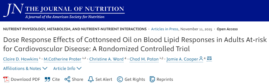 ①Claire D, M Catherine, et al., Dose–Response Effects of Cottonseed Oil on Blood Lipid Responses in Adults at Risk of Cardiovascular Disease: A Randomized Controlled Trial, The Journal of Nutrition,2025,ISSN 0022-3166