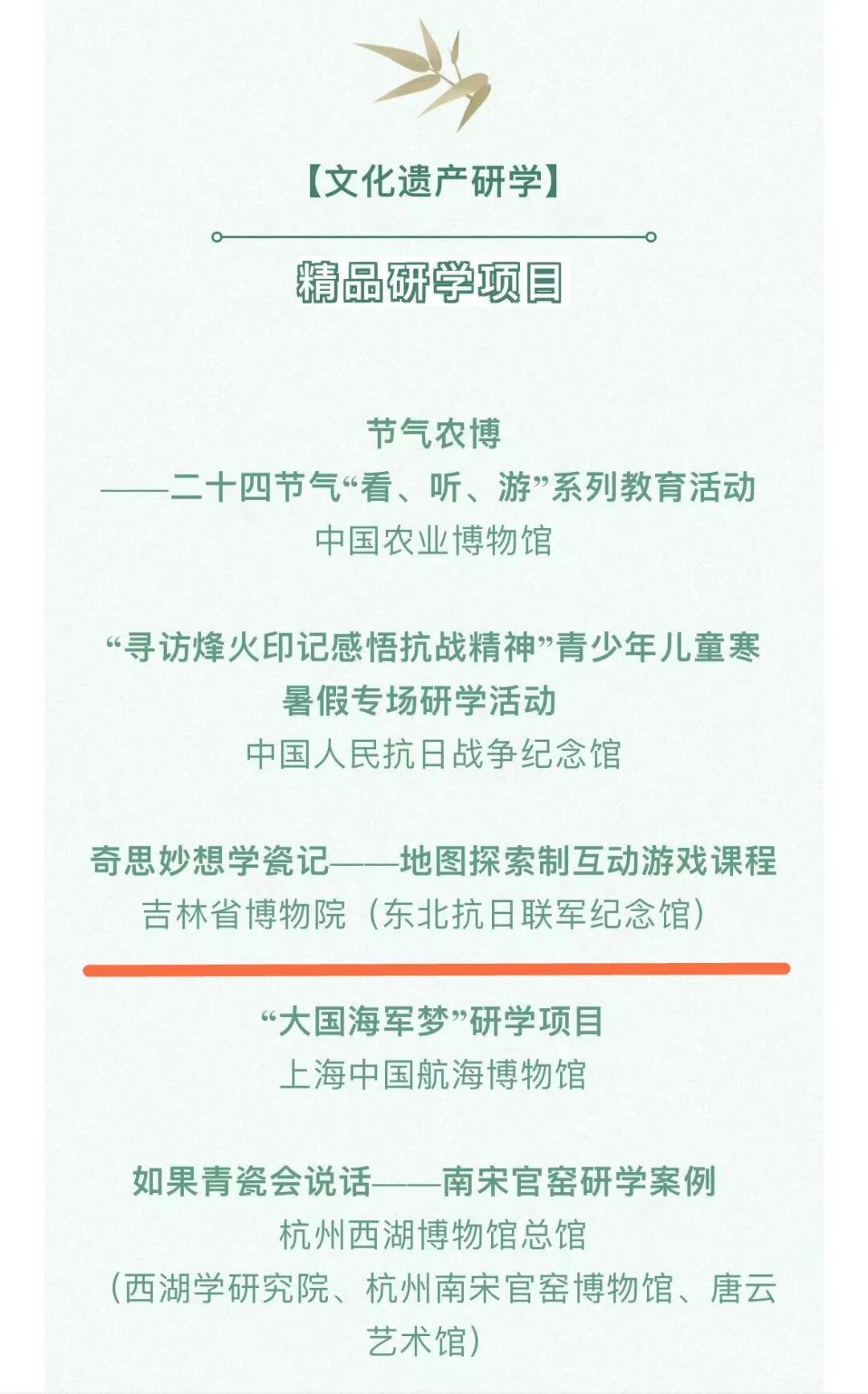 经过现场实名投票环节,“奇思妙想学瓷记——地图探索制互动游戏课程”成功入选20个全国精品研学项目之列,这一荣誉是对吉林省博物院(东北抗日联军纪念馆)研学系列活动成果的又一次有力肯定。