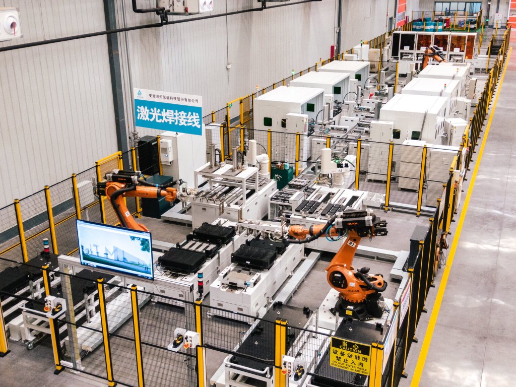 在六松现代产业园里,明天氢气是一家专注于清洁能源开发与应用的公司,为氢能交通运输、储能电站、氢能工业等领域提供产品和解决方案。明天氢能品牌总经理张健向澎湃新闻记者介绍,该公司已签约2025年行业内的第一大单——500台氢能重卡。目前,其系统驱动的113辆公交车分布在六安、合肥等城市,单车百公里氢耗不超过5千克,这一指标处于行业领先水平。
