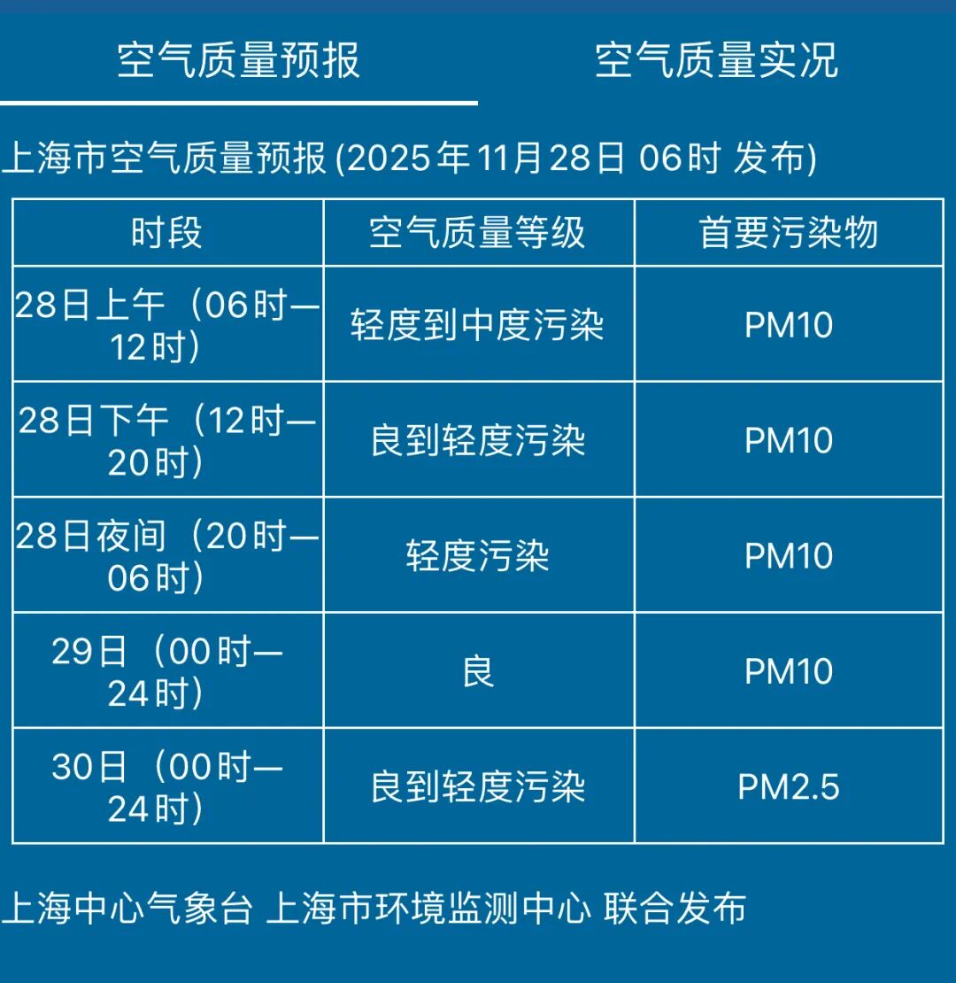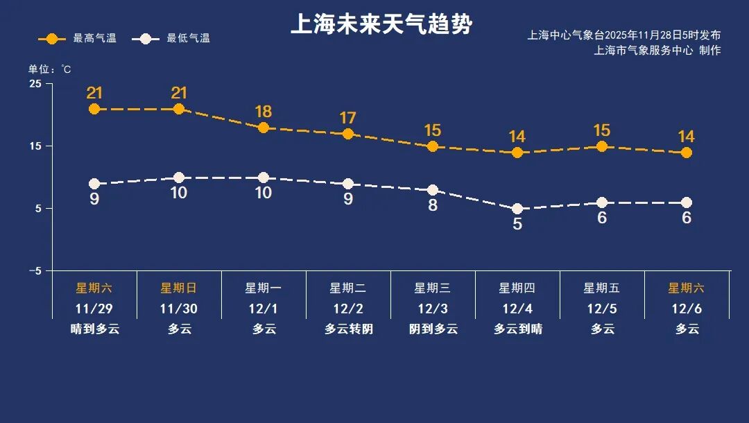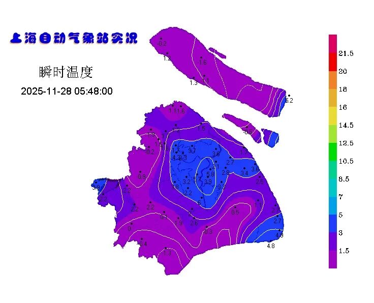 11月28日,本市天气晴到多云。受早晨辐射降温影响,中心城区最低气温降至5℃左右,多个郊区气温跌破冰点,其中崇明最低,仅为-1.7℃,局部地区出现薄冰,体感寒冷,公众需注意保暖。白天在阳光加持下,最高气温回升至15℃。风力较昨日显著减弱,早晨为偏北风,上午转为南到东南风,风力3~4级;相对湿度处于20%~60%之间,空气依旧干燥,需注意用火用电安全。