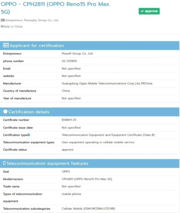 其中,OPPO Reno 15 Pro Max首次在泰国NBTC认证中出现,不过阿联酋TDRA和新加坡IMDA目前还未批准该型号,这意味着它或许不会在所有市场同步发售。值得关注的是,从TDRA认证信息可以得知,该系列全系都支持80W有线快充。