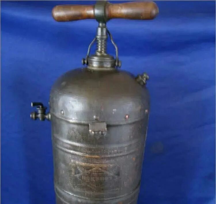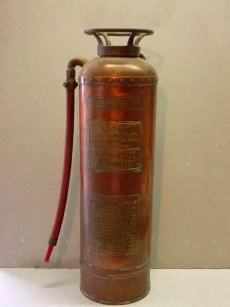 1910年,特拉华州芘制造公司申请了四氯化碳灭火器专利,次年又推出小型便携式四氯化碳灭火器。这种灭火器采用黄铜或铬制容器,配有集成手泵,通过喷射液体抑制燃烧链式反应灭火,但因健康风险逐渐被淘汰。
