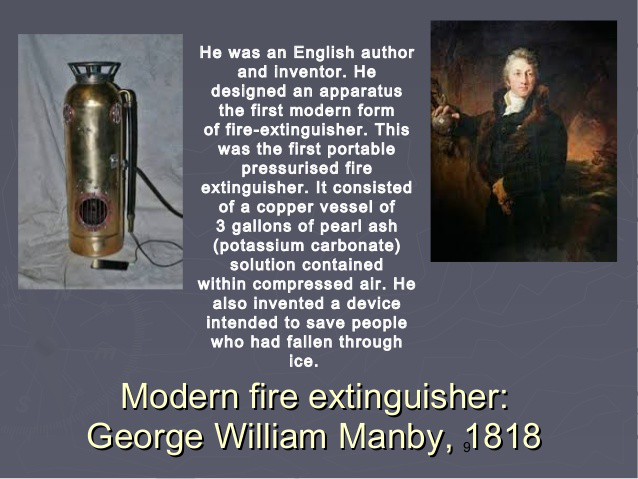 1818年,曼比船长发明了世界上首个便携式灭火器,它被视作现代灭火器的雏形。