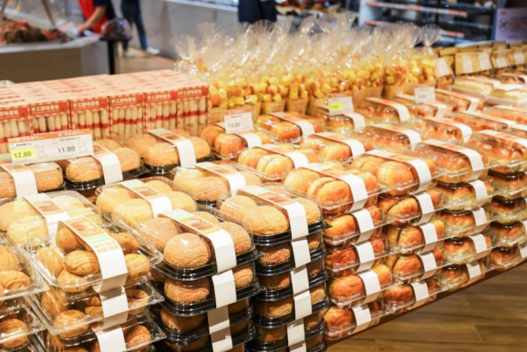 合家福高新店调改后,在丰富特色小吃的同时,将水果、烘焙、熟食等品类前置,消费者一进门就能感受到鲜艳色彩与诱人香气,烟火气十足。