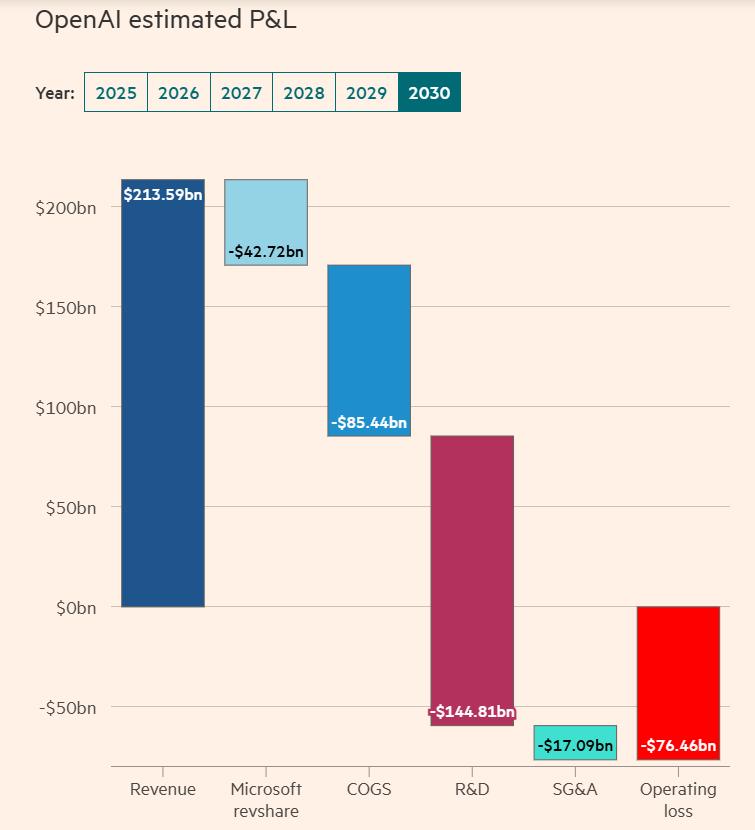 然而,营收增长背后隐藏着严峻的成本压力。随着业务规模扩大,OpenAI的运营成本也将同步激增,这意味着其毛利率在相当长时间内将持续为负值。根据预测,直到2030年,OpenAI的毛利率才能勉强转正至6%的水平。