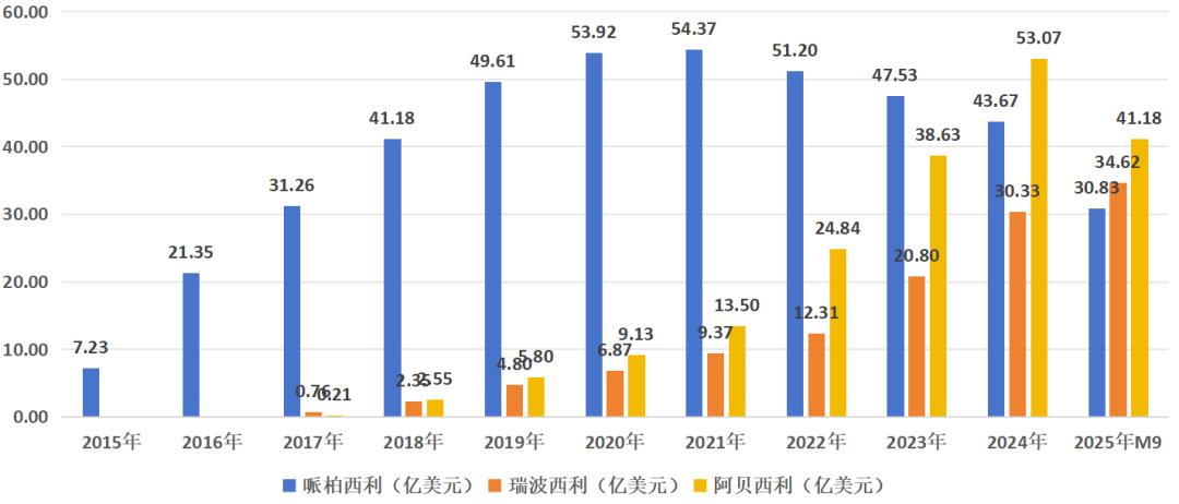 全球市场中,辉瑞哌柏西利、诺华瑞波西利(Kisqali)、礼来阿贝西利三分天下,2024年合计营收127.07亿美元,同比增长18.8%,保持高速增长。