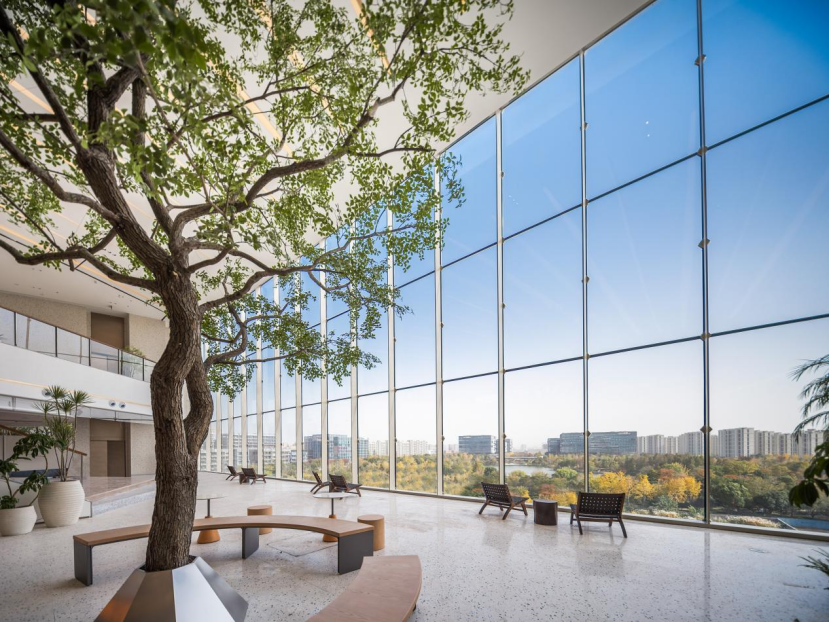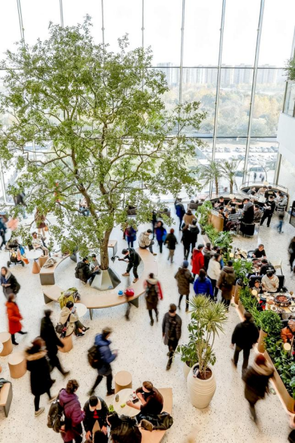 位于项目五至六层的“丰收湖之眼”,凭借10米挑高的跨层空间与全景玻璃幕墙,构建起一个能与自然深度互动的“城市之窗”,将优质景观资源转化为沉浸式空间体验。透过宽大的玻璃界面,丰收湖公园的四季景致如同流动的画卷,为空间持续注入自然活力。这里汇集了蝴蝶里、烤匠等特色餐饮品牌,通过绿植造景与内退式外摆设计,共同打造出通透开放的聚餐社交理想场所。